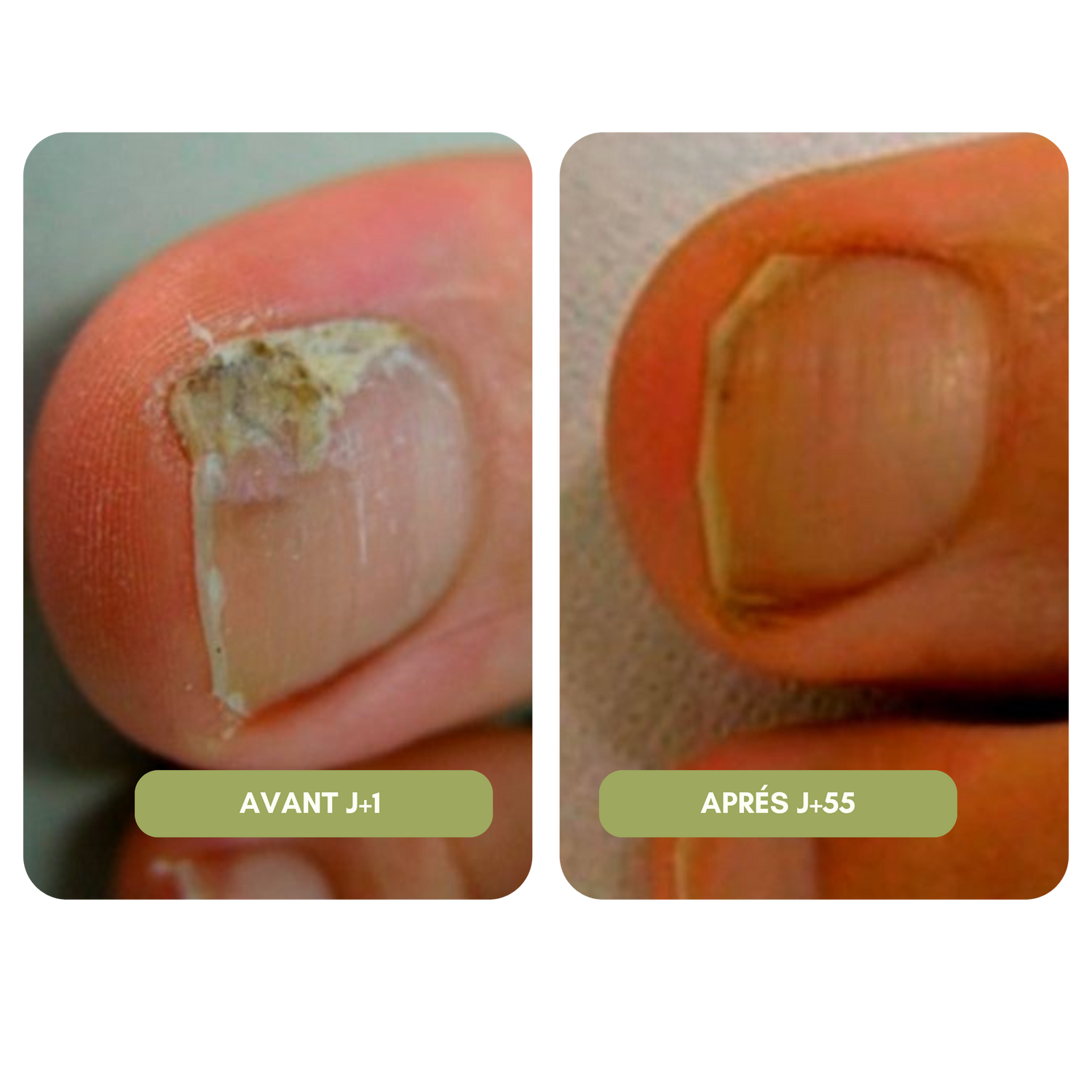 Mon ongle sentait mauvais même après la douche. J'avais tellement honte que j'avais arrêté le yoga — impossible de retirer mes chaussettes devant les autres. Ma vie sociale s'était réduite à cause d'un seul ongle. J'ai découvert MYCÉA et j'ai tenté sans trop y croire. Résultat après 2 mois sur la photo. Je ne dis pas que c'est un miracle mais pour moi, personnellement, ça l'est. Je suis retournée en cours de yoga la semaine dernière, pieds nus, sans stress. Une sensation que je pensais avoir perdue.