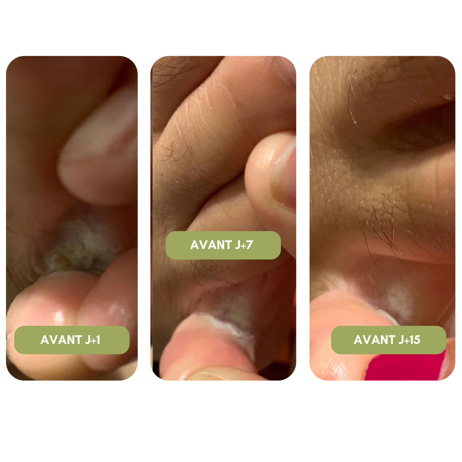 J'avais une mycose entre les orteils depuis presque un an. Une peau blanche, macérée, qui desquamait, des démangeaisons insupportables surtout le soir sous la couette. Je grattais sans m'en rendre compte et ça empirait. J'avais essayé des poudres, des sprays en pharmacie — ça calmait deux semaines puis ça revenait. J'ai commencé MYCÉA en me disant que c'était mon dernier essai avant d'aller voir un dermatologue. J'ai pris une photo à J1, J7 et J15 pour me forcer à être honnête sur les résultats. À J7 la macération avait clairement diminué. À J15 la peau entre mes orteils était sèche, propre, sans irritation. Je n'avais plus envie de me gratter. Pour quelque chose qui m'avait gâché des nuits entières, c'est un soulagement que les mots ont du mal à décrire.