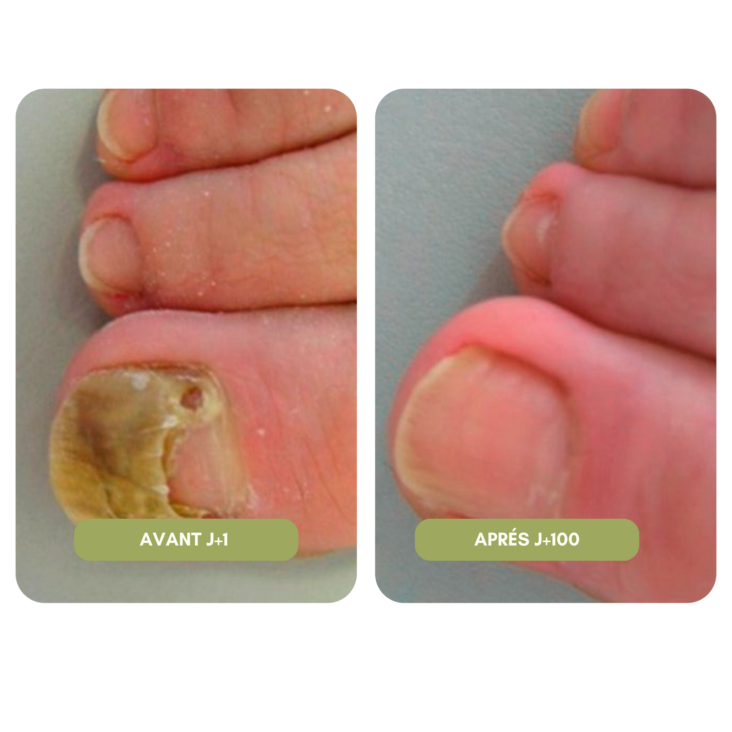 Ça fait 3 ans que je cachais mes pieds. 3 ans que je refusais les sandales l'été, que je prenais ma douche en dernier pour que personne ne voie mes ongles. Mon ongle du gros orteil était devenu méconnaissable — épais, jaune, cassant. J'avais honte d'une partie de mon propre corps. J'avais essayé deux traitements en pharmacie, rien n'avait vraiment marché. Quand j'ai commandé le savon MYCÉA je me disais "encore un truc qui va rien faire". Après 6 semaines, mon orteil ressemble à ça. Je pleure en écrivant ce commentaire parce que je réalise que j'ai retrouvé quelque chose que j'avais perdu — me sentir normale.
